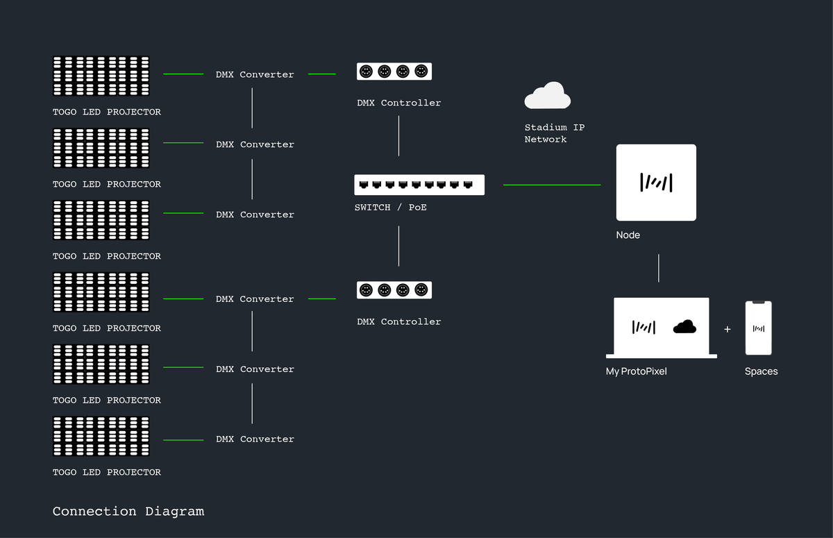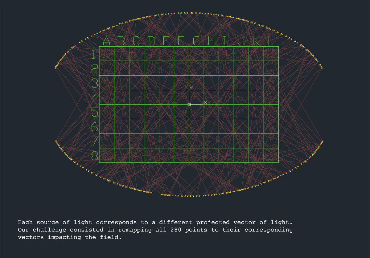 The existing 372 metal halide floodlights, which were installed in 2012 as part of the renovation works for the 2014 World Cup, were replaced by 280 LED projectors (TOGO). In the diagrams displayed below, you can observe the schematic connection for integrating the projectors to our technology. The whole installation is running on LED projectors, DMX controllers, and one . The equipment was installed by Tecnowatt, a Brazilian company, member of our partner Simon's group. Each source of light corresponds to a different projected vector of light, and our challenge consisted in remapping all 280 points to their corresponding vectors impacting the field.
