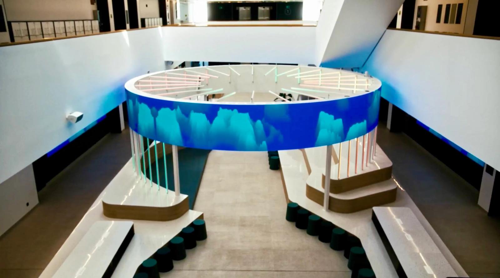 The Core School is the Educational Hub of international reference for professionals in the audiovisual leisure and entertainment industry. It is located in Madrid, the largest audiovisual hub in Europe. Specialized training created based on the real needs of the major players in the entertainment and fiction content industry.In mid-2021, Ignasi Llauradó, CEO & Creative Director of Dear design Studio, contacted ProtoPixel with the main of illuminating and enlivening the atrium of the school in an interactive, dynamic and youthful way.