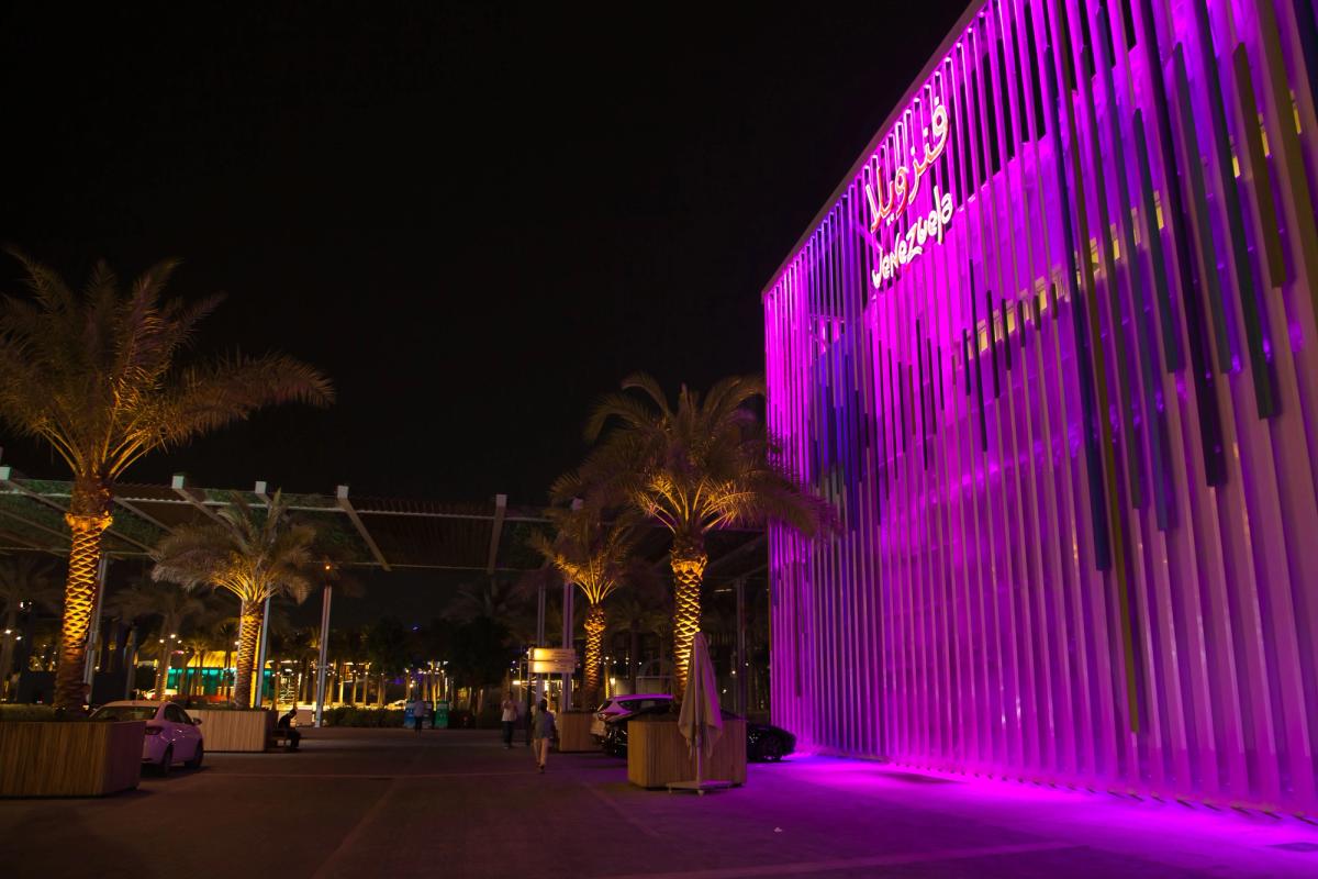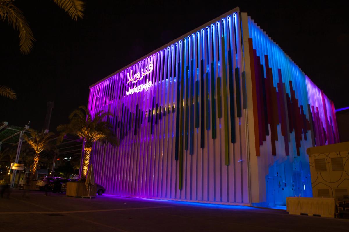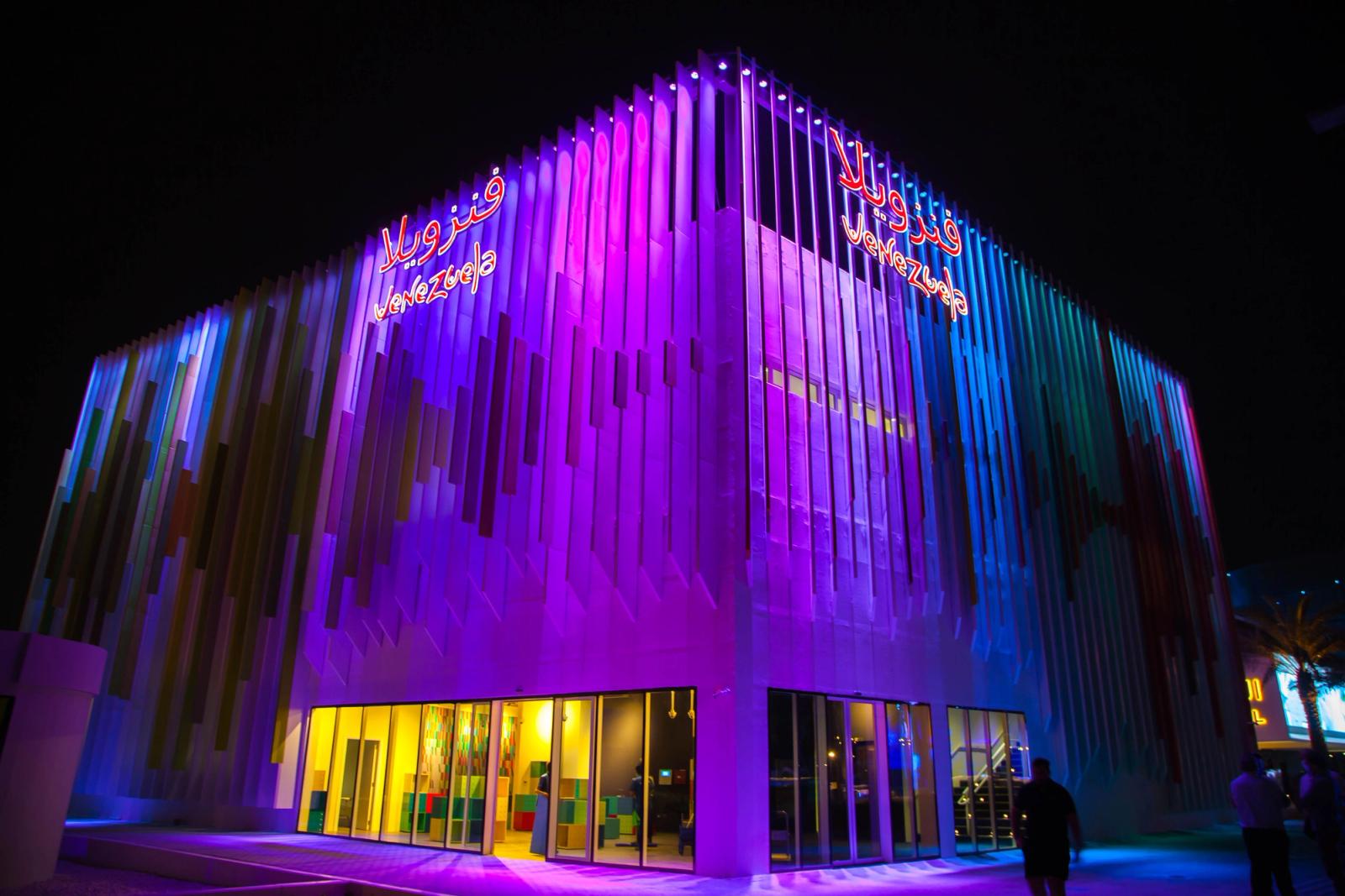 Our client contacted us to develop the lighting control system of Venezuela's Pavilion façade for , the biggest event for innovation, technology, culture, architecture, and art in the world that was postponed to 2021.Built as a tribute to the late Venezuelan artist –a major protagonist in the field of Kinetic and Optical Art and one of the key 20th-century thinkers in the realm of color– and designed by architect Wanders Werner Falasi, the pavilion's façade is dressed with lots of slats that create a waveform and that can be controlled dynamically using our all-in-one lighting platform.From the content point of view, the mapping of the fixtures is designed transversal across all 4 façade sides so that one can create linear effects such as the waveform.