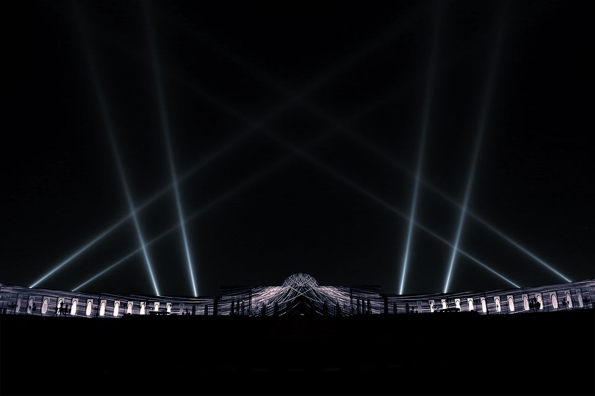ProtoPixel provided the lighting and control technology behind the award-winning installation MAESTRO by the new media studio . The installation was set up on a half-kilometre long building with 19 video projectors of 20,000 lumens and 8 sky-tracers.