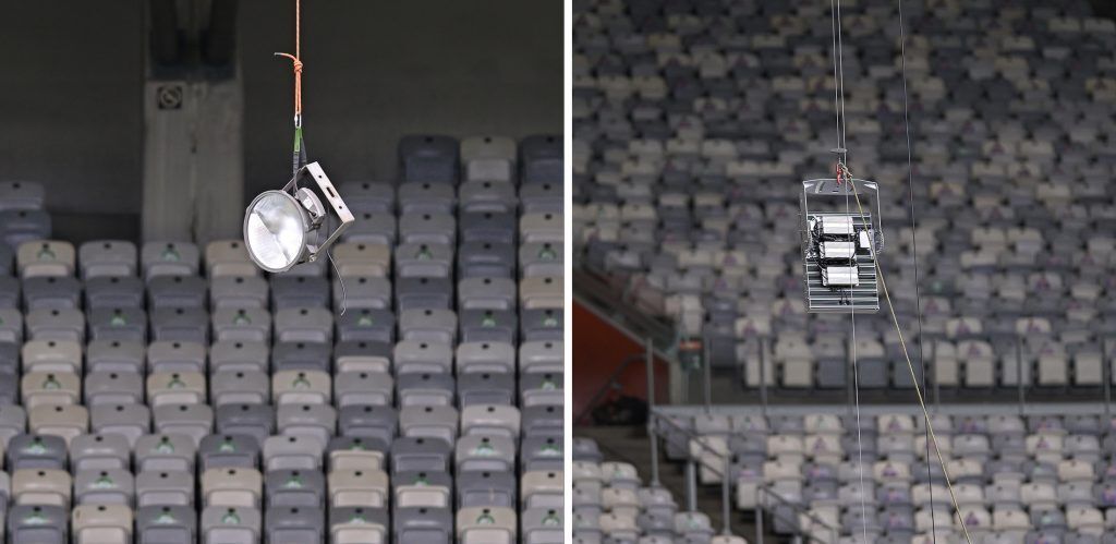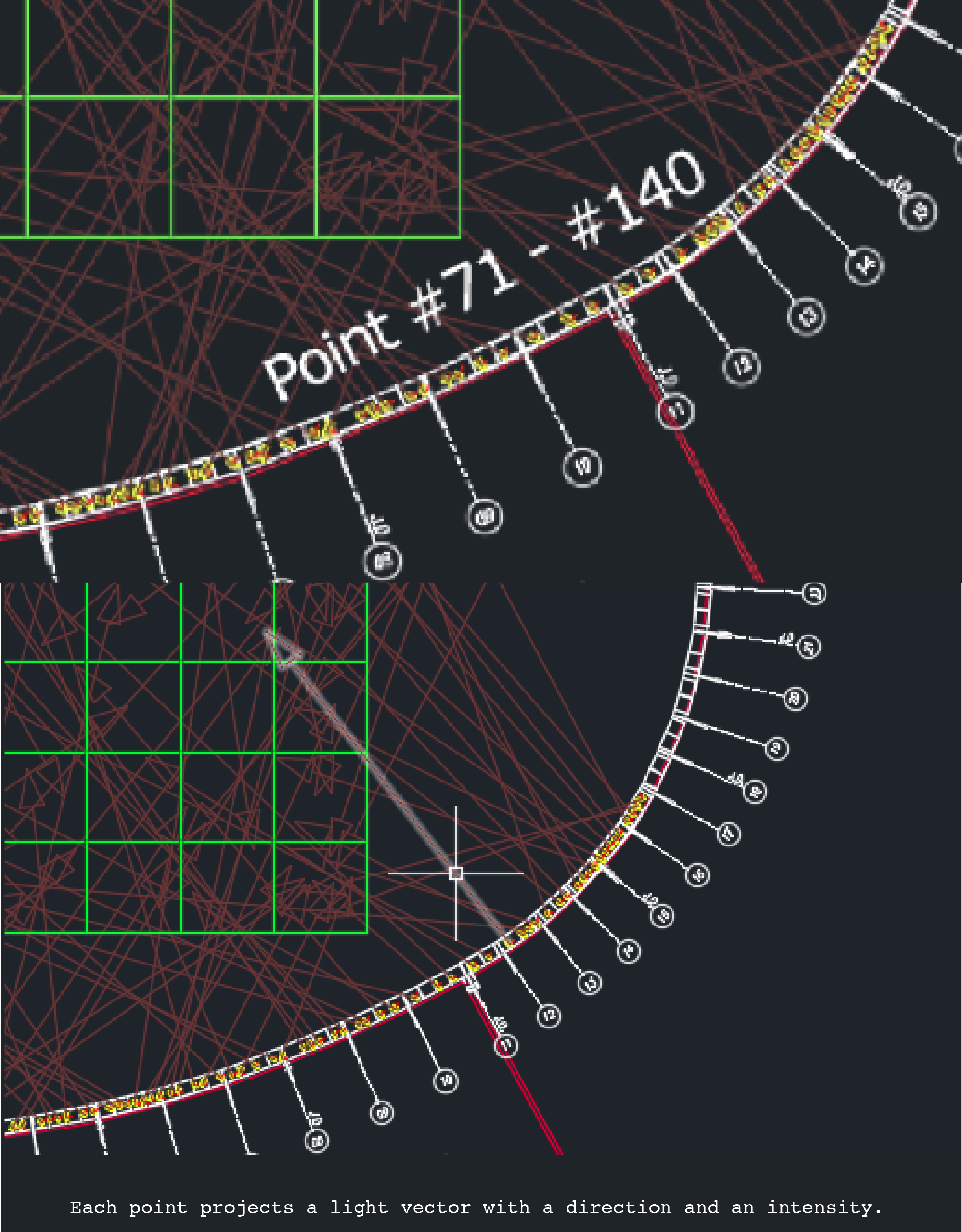 The existing 372 metal halide floodlights, which were installed in 2012 as part of the renovation works for the 2014 World Cup, were replaced by 280 LED projectors (TOGO). In the diagrams displayed below, you can observe the schematic connection for integrating the projectors to our technology. The whole installation is running on LED projectors, DMX controllers, and one . The equipment was installed by Tecnowatt, a Brazilian company, member of our partner Simon's group. Each source of light corresponds to a different projected vector of light, and our challenge consisted in remapping all 280 points to their corresponding vectors impacting the field.