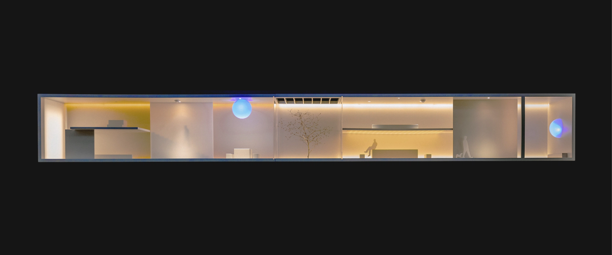 The construction of 70 square meters of surfaces with a four-sided roof is crowned by a skylight. Inside, porcelain plates replicate the look of stone, reminiscent of the original cave rocks. Inspired in Barcelona, SPA was made in collaboration with Guillermo Santomá and Simon Electric.