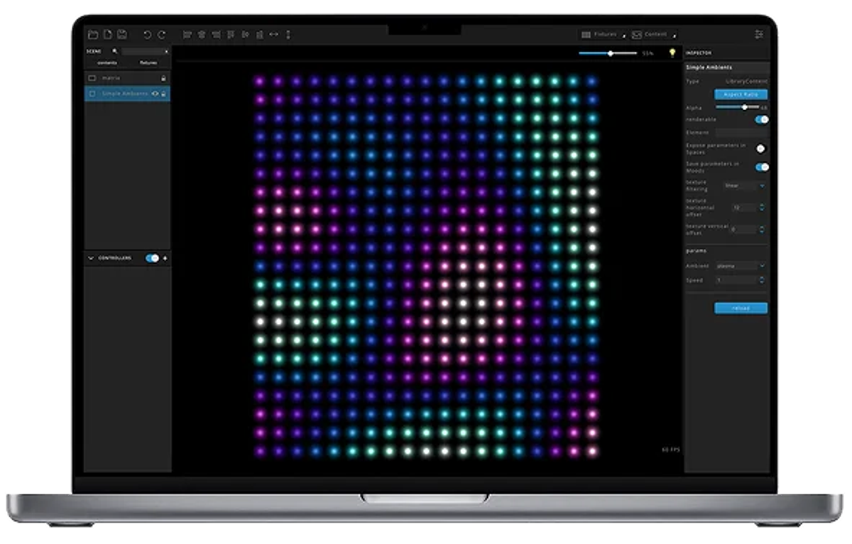 → Create moods using color, video, scripts, NDI, Syphon, shaders, and more.