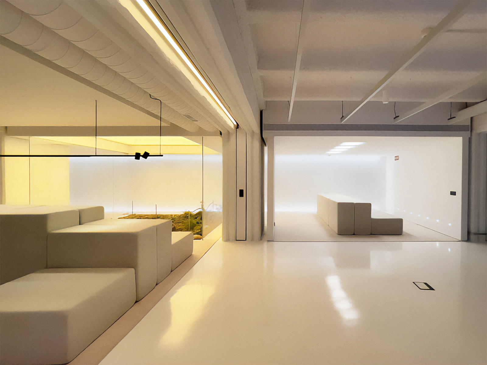 The first floor is characterized by the need for functional light: it is a working and physical product display area. On the other hand, we enter a more experiential world on the second floor, where light becomes emotion. We focus on recreating light in the main spaces of our homes. Starting the tour in the bedroom we see the complete lighting simulation from waking up to going to bed.Made with: