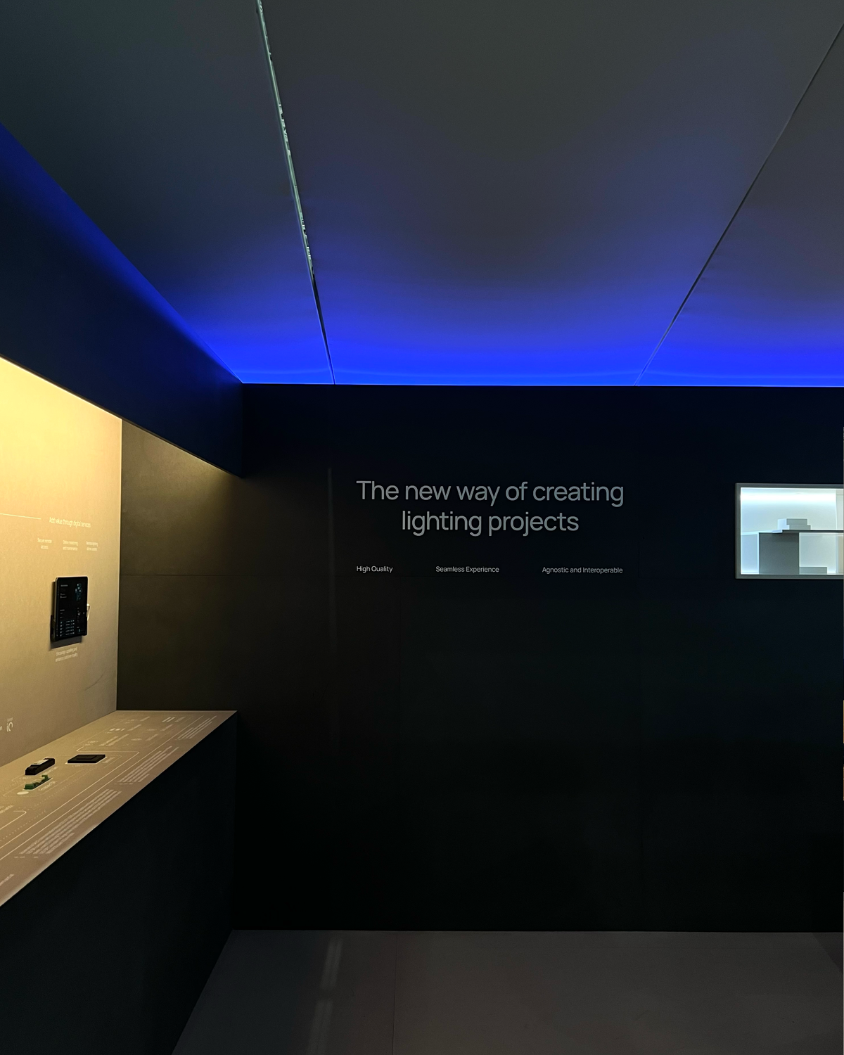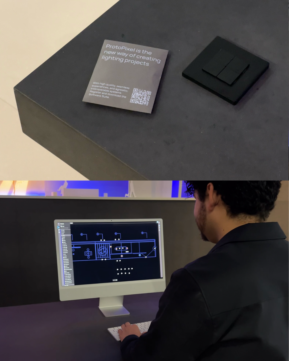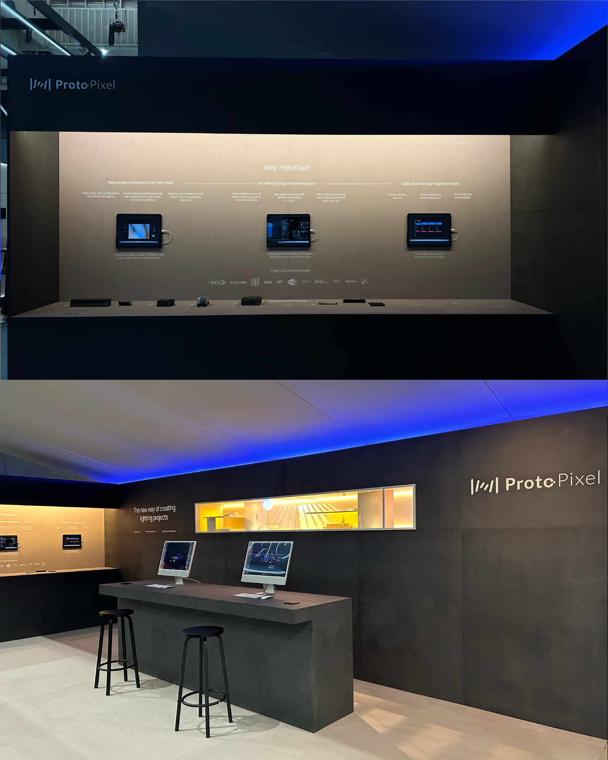 ProtoPixel provides solutions and adds value in all stages of the lighting project, at any scale. With it you can deliver high quality projects, with seamless experiences, in an agnostic and interoperable way. In the design phase, you can take it to the next level with our agile tools, allowing pre-configuration, and preview of projects. Mapping Tool any type of atmosphere, from tunable white, color, both static and dynamic. Develop a greater number of projects with more added value and differentiation. Accelerate project implementation by centralizing it into one infrastructure, including both wired and wireless projects, and improve your revenue through 3x faster, more robust, future-proof execution.The stand design featured three main areas: the product wall, the demo wall, and the showcase screen. Visitors were guided through the process of creating lighting projects in a hands-on experience with the . They followed the journey through stages of design, implementation, and digital services. It was crucial for us to have an interactive space for our demos, as we place utmost value on our "show, don't tell" policy. We believe that the interaction between visitors and the ProtoPixel Platform should be straightforward and intuitive.